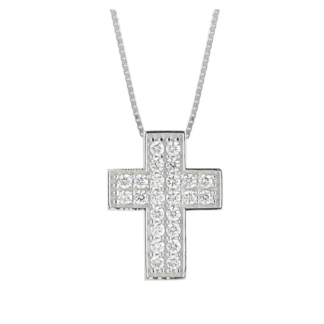 Collana con pendente a croce in oro 18 carati alta 1,4 e larga 1,0 cm, con pavé di diamanti bianchi naturali. Il pendente è disponibile nei tre colori dell'oro: bianco, rosa o giallo. La catena in oro bianco a maglia veneziana è lunga 43 cm con possibilità di chiusura a 40 e 38 cm per garantire una indosso sempre perfetto.