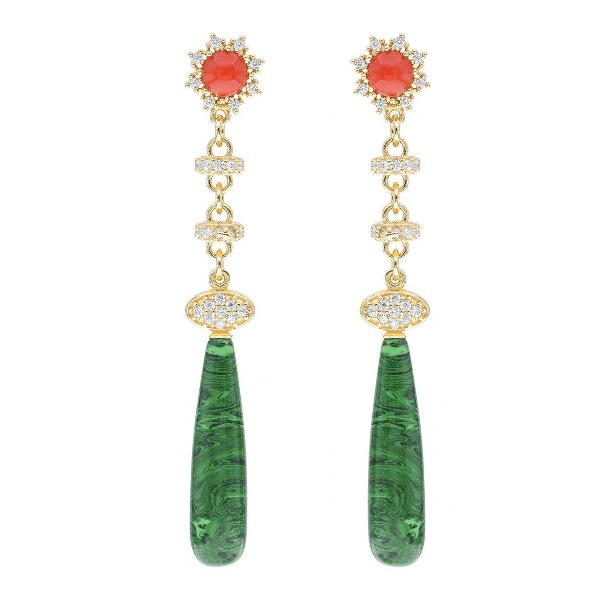 Orecchini in argento con zirconi, corallo e pasta di malachite. Collezione Adalia capsule di Koliè 925.
